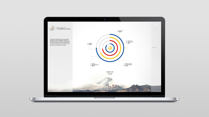 五个同心圆是根据厄瓜多尔国旗的颜色而设计,每个同心圆可根据当前国家统计局的数据状况,自动和不断变化的标志的形状。